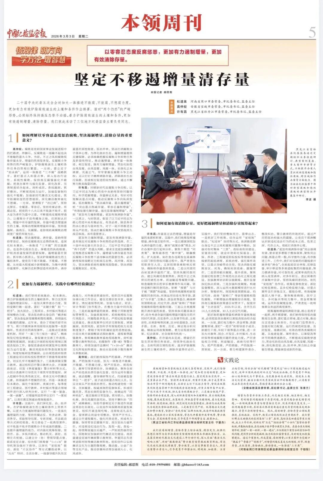 杜道泉:坚决遏增量、清存量,是始终坚持零容忍、保持反腐败高压态势的体现,是深化标本兼治、一体推进“三不腐”的实践路径,也是净化政治生态、厚植党的执政根基、护航高质量发展的重要保障。遏增量重在预防、抓早抓小抓苗头,坚决铲除腐败滋生的土壤和条件,使党员干部不敢腐、不能腐、不想腐,从而最大程度减少新增腐败,为集中清理存量案件、化解历史积弊创造有利条件。清存量重在深挖彻查、惩治并举,坚决打消腐败分子侥幸心理,为净化政治生态、遏制增量提供关键保障。必须准确把握反腐败斗争形势任务及阶段性特征,推动遏增量、清存量一体推进、相互促进,既有力遏制增量,常态化防范由风及腐、由风变腐、风腐一体,长效化正本清源、充盈正气,牢牢掌握反腐败斗争主动权;又以钉钉子精神清除存量,消除政治生态污染源,形成相互促进的良性循环,通过不懈努力换来海晏河清。